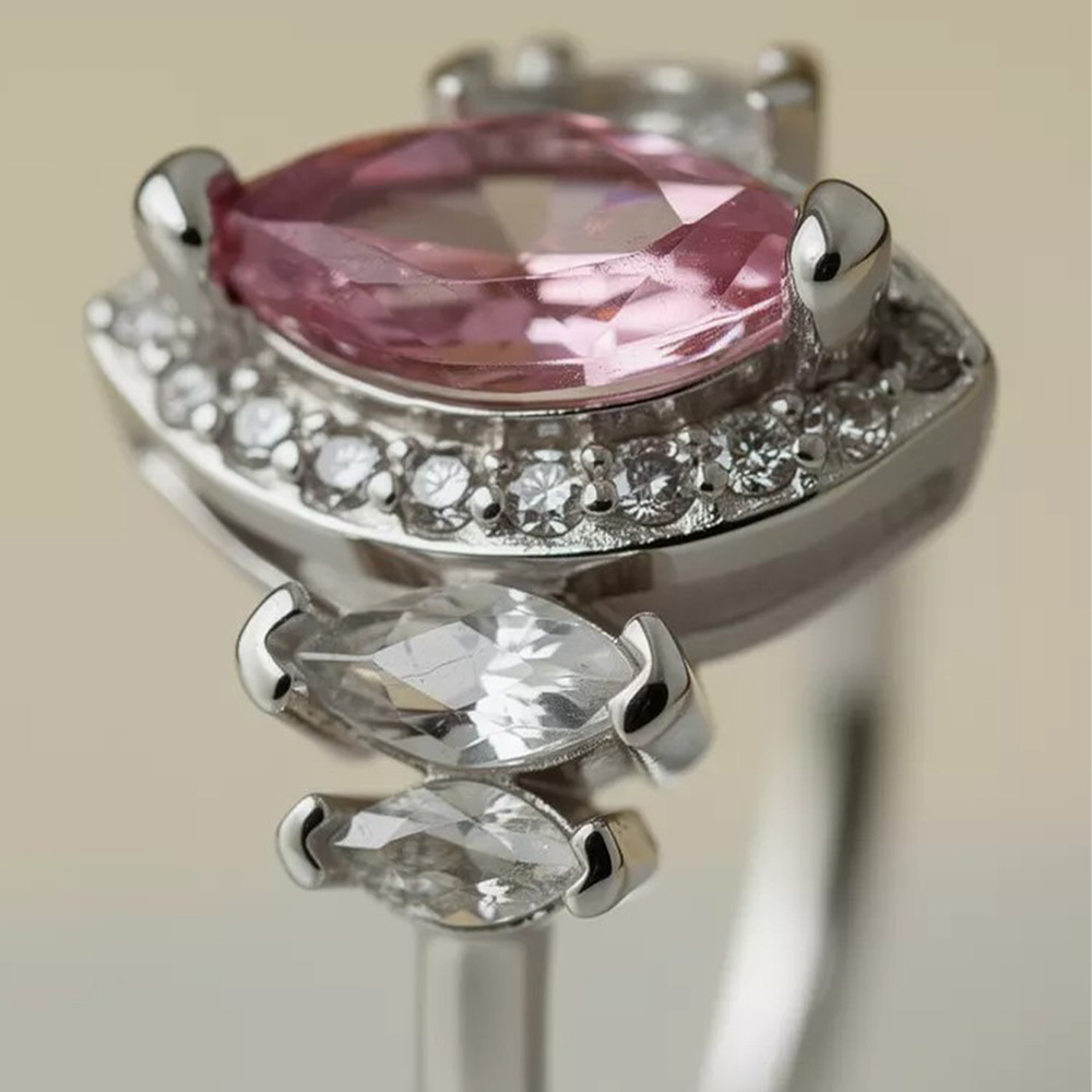 A Vision of Pastel Perfection The Blush Marquise Empress Ring is a celebration of feminine strength and vintage-inspired luxury. The focal point is a perfectly faceted marquise-cut stone in a delicate blush-pink hue, specifically chosen for its romantic glow and elongated, finger-flattering shape.