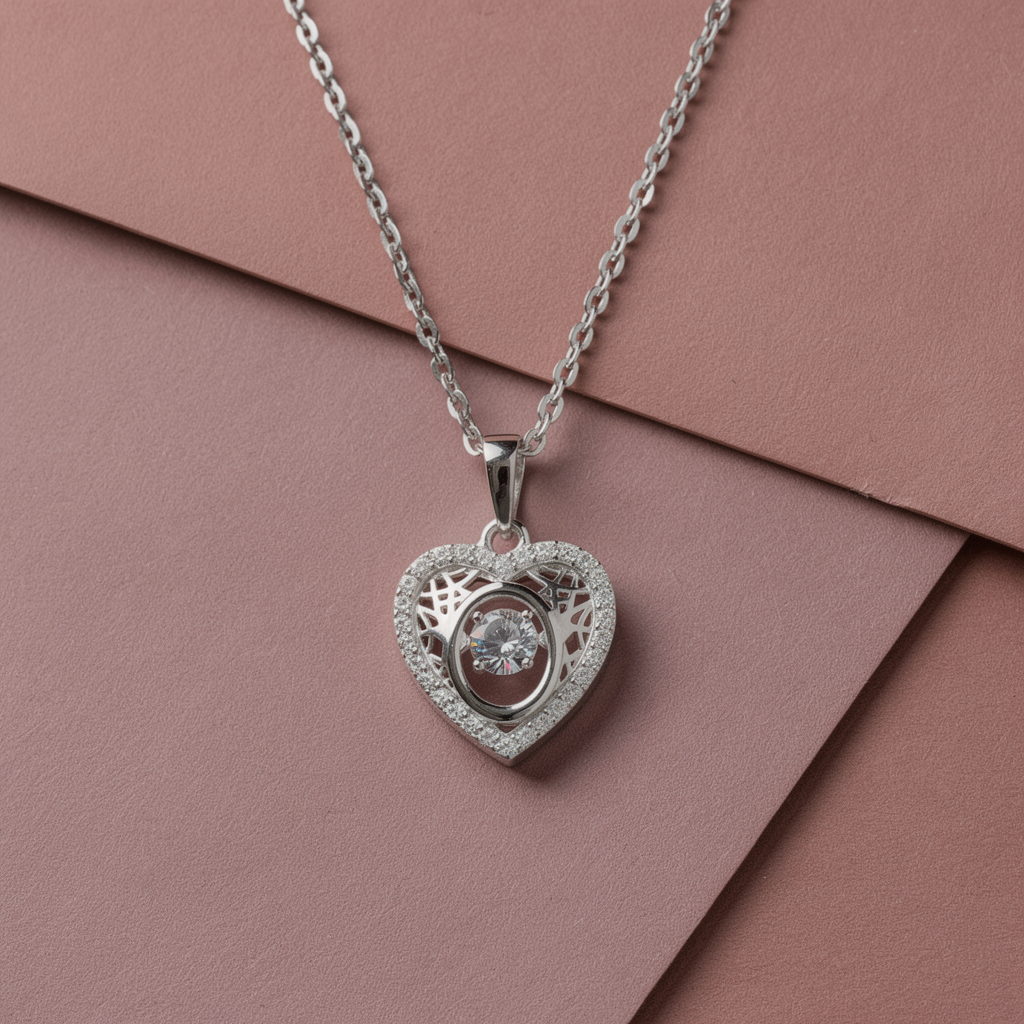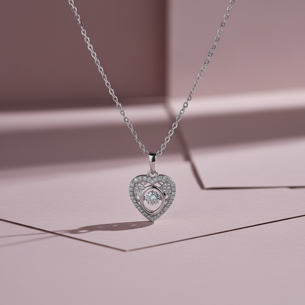 At the center lies a captivating dancing diamond stone that continuously moves and reflects light with every slight motion — creating a breathtaking sparkle effect. The floating design enhances brilliance, making the pendant look alive with shine.