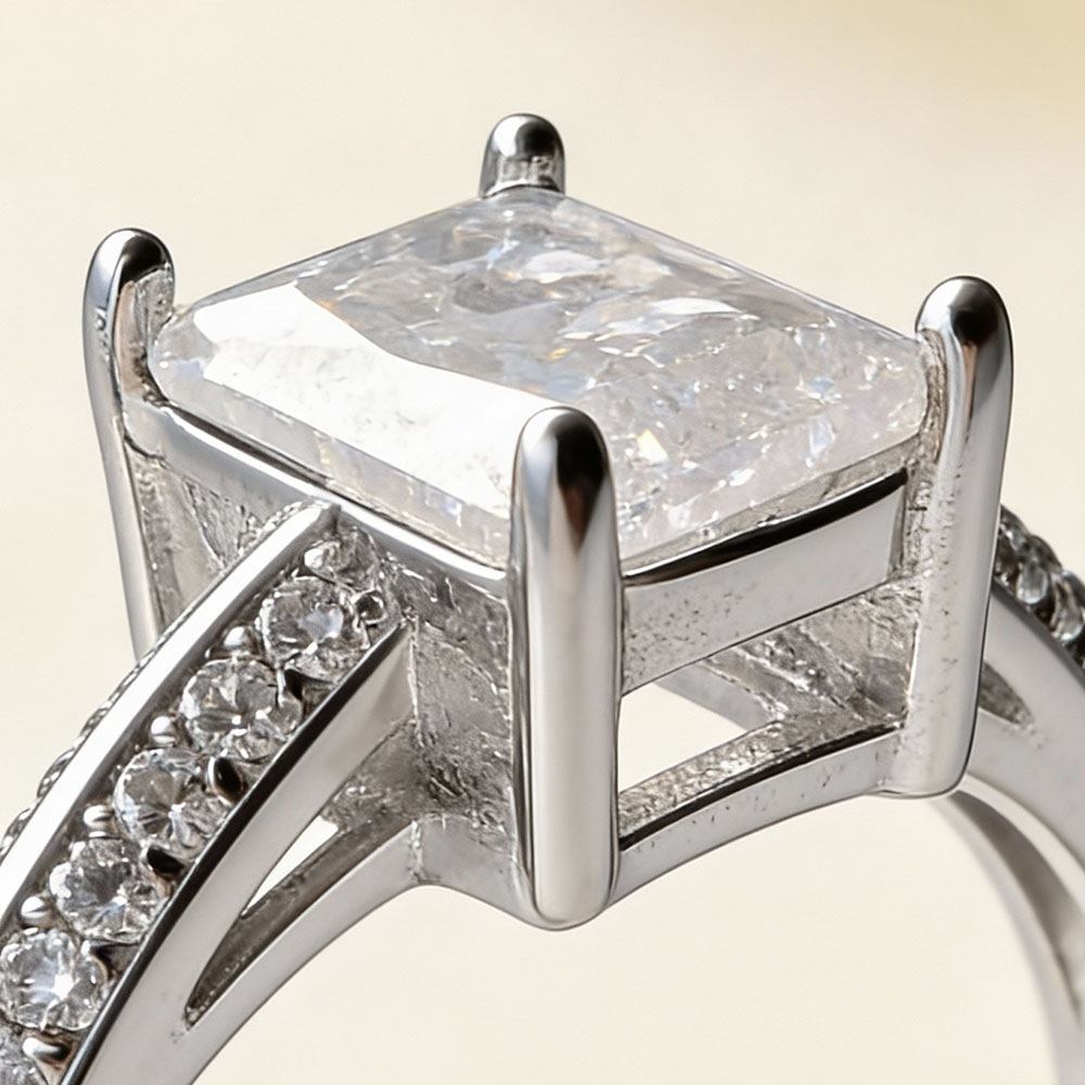 Designed for those who love classic elegance with a modern touch, this Emerald-Cut Solitaire CZ Silver Ring is a true statement of refined beauty. The striking emerald-cut center stone is elevated by a sleek prong setting, while subtle CZ detailing along the band adds just the right amount of sparkle.