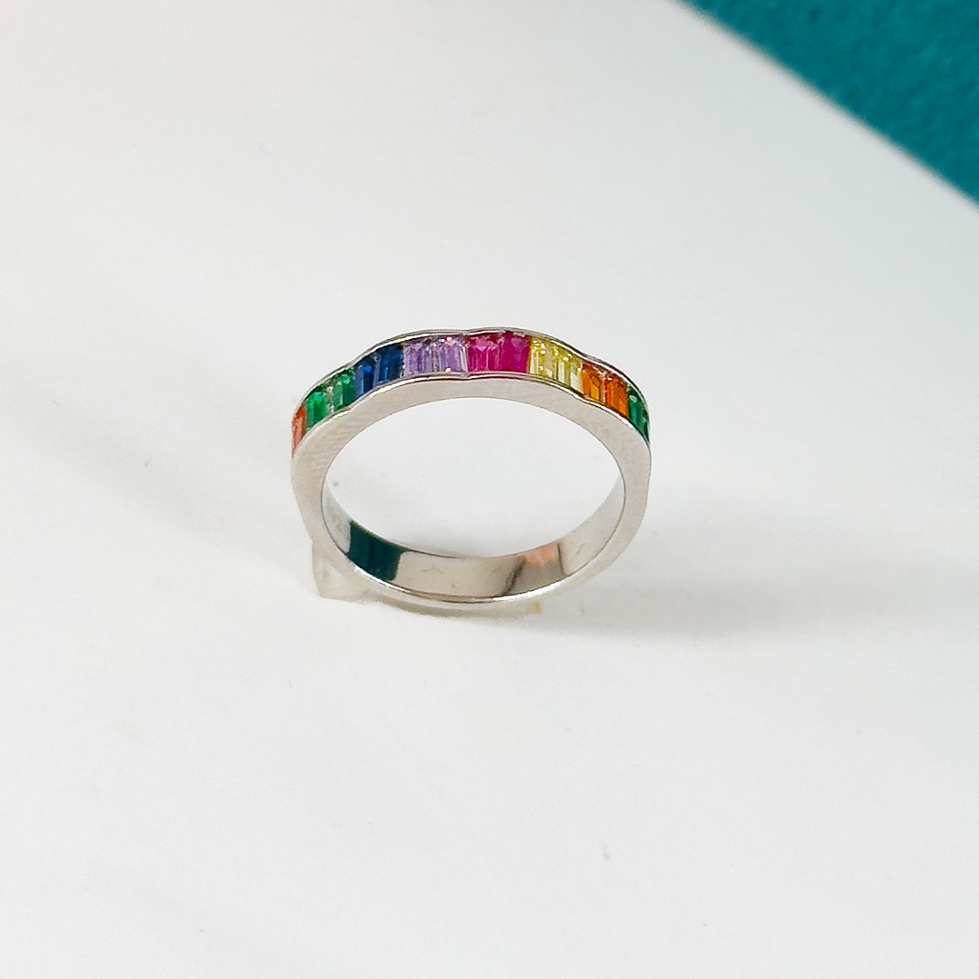 A sleek sterling silver band adorned with vibrant baguette-cut rainbow stones for a touch of color and elegance.