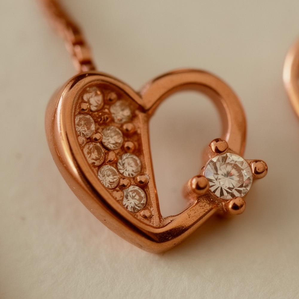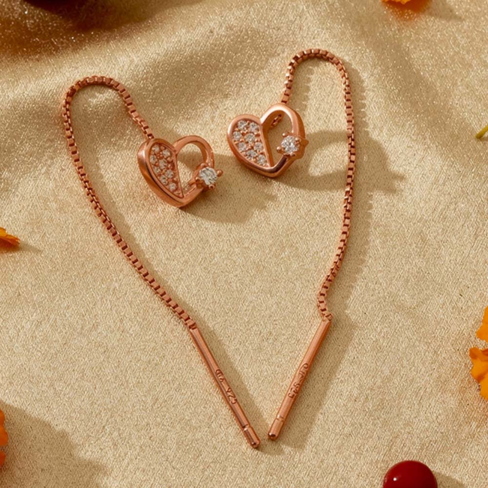 Designed for modern romantics, the Rosé Heart CZ Silver Thread Earrings feature a delicate heart motif finished in a warm rose-gold tone. One side of the heart is embellished with fine CZ stones, while a solitaire CZ accent adds a subtle sparkle that catches the light beautifully.